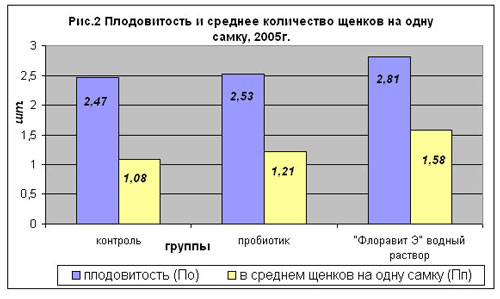 Если оценивать показатели прироста в целом по каждой из групп, то и здесь наблюдаются аналогичные результаты. При применении пробиотика среднее количество щенков на каждую самку Пп выросло всего на 0,13 штуки (на 12% по сравнению с контрольной группой), а в группе, получавшей "Флоравит Э" прирост Пп был выше и составил 0,5 щенка на каждую самку стада (или на 46,3% по сравнению с контрольной группой).