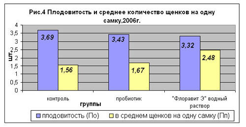 Относительное уменьшение плодовитости По как в группе, получавших пробиотик (на 7% по сравнению с контрольной группой), так и в группе самок, получавших БАД "Флоравит Э" (на 10% по сравнению с контрольной группой), рис 4, связано с вовлечением в процесс щенения изначально ослабленных особей, у которых, возможно, без "Флоравит Э" и пробиотиков вообще бы не наступила истинная беременность.