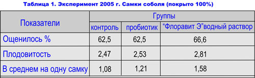 В 2005 г. добавление "Флоравит Э" в корм осуществлялось самкам соболей в период, уже наступившей, истинной беременности - период 2 месяца с 30 марта по 8 июня 2005 г.